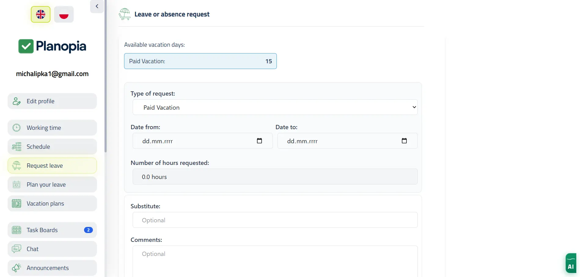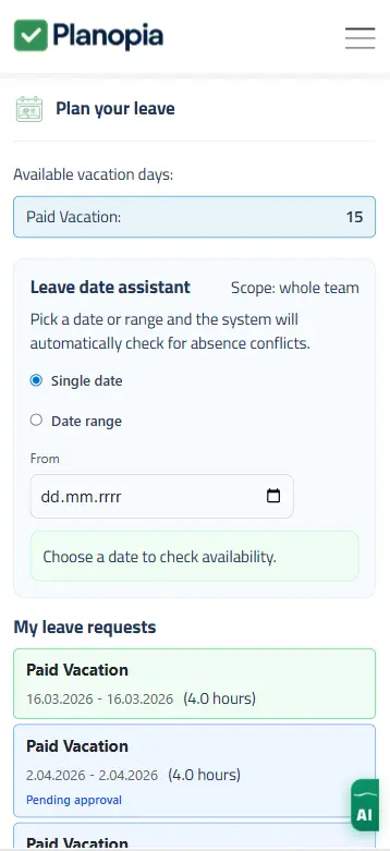 Search demand often pairs leave planning with time tracking and overtime. Recording hours first makes leave planning easier. In Planopia, time tracking and leave sit in the same team account on eligible plans. Read more: online time tracking — and electronic time tracking guide.