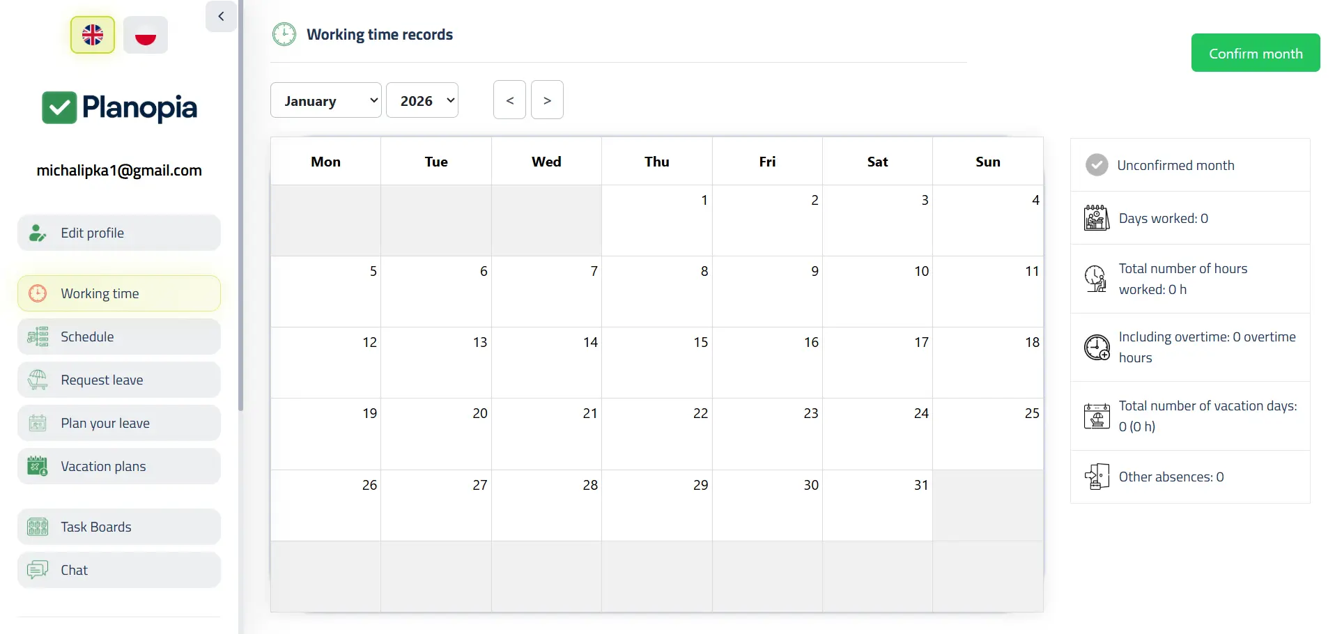 Planopia combines time tracking, leave management, work schedules, team chats, task boards (Kanban), and flexible role configuration. Everything in one app, without the need for multiple separate tools.