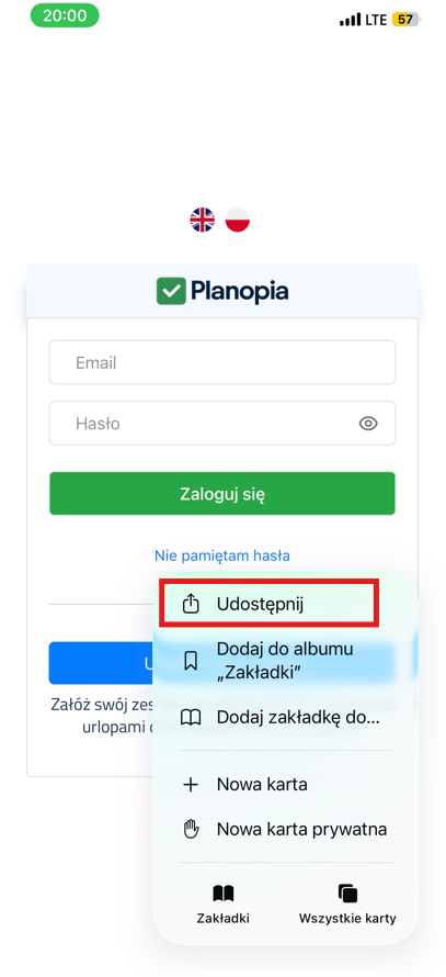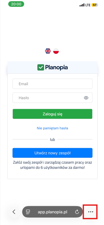 Open Safari browser on your iPhone and go to Planopia login page: app.planopia.pl