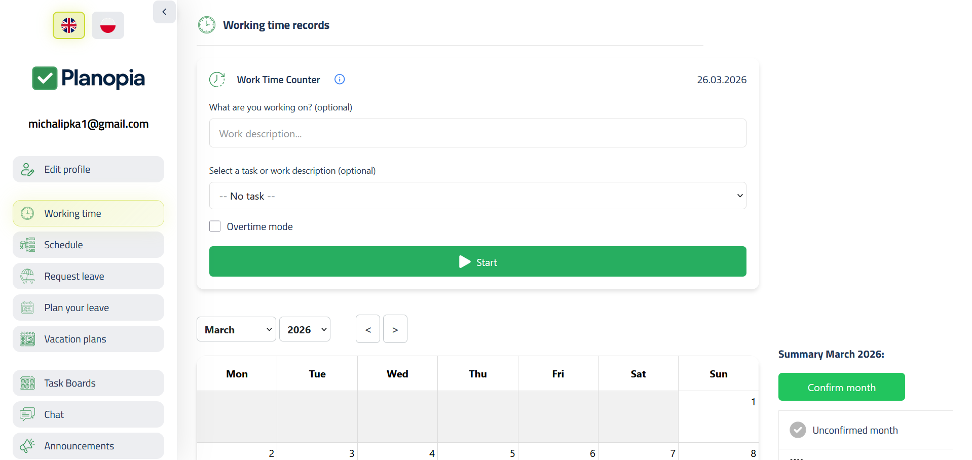 - Time tracking — fast entries, monthly calendar, reports, PDF / Excel export.
